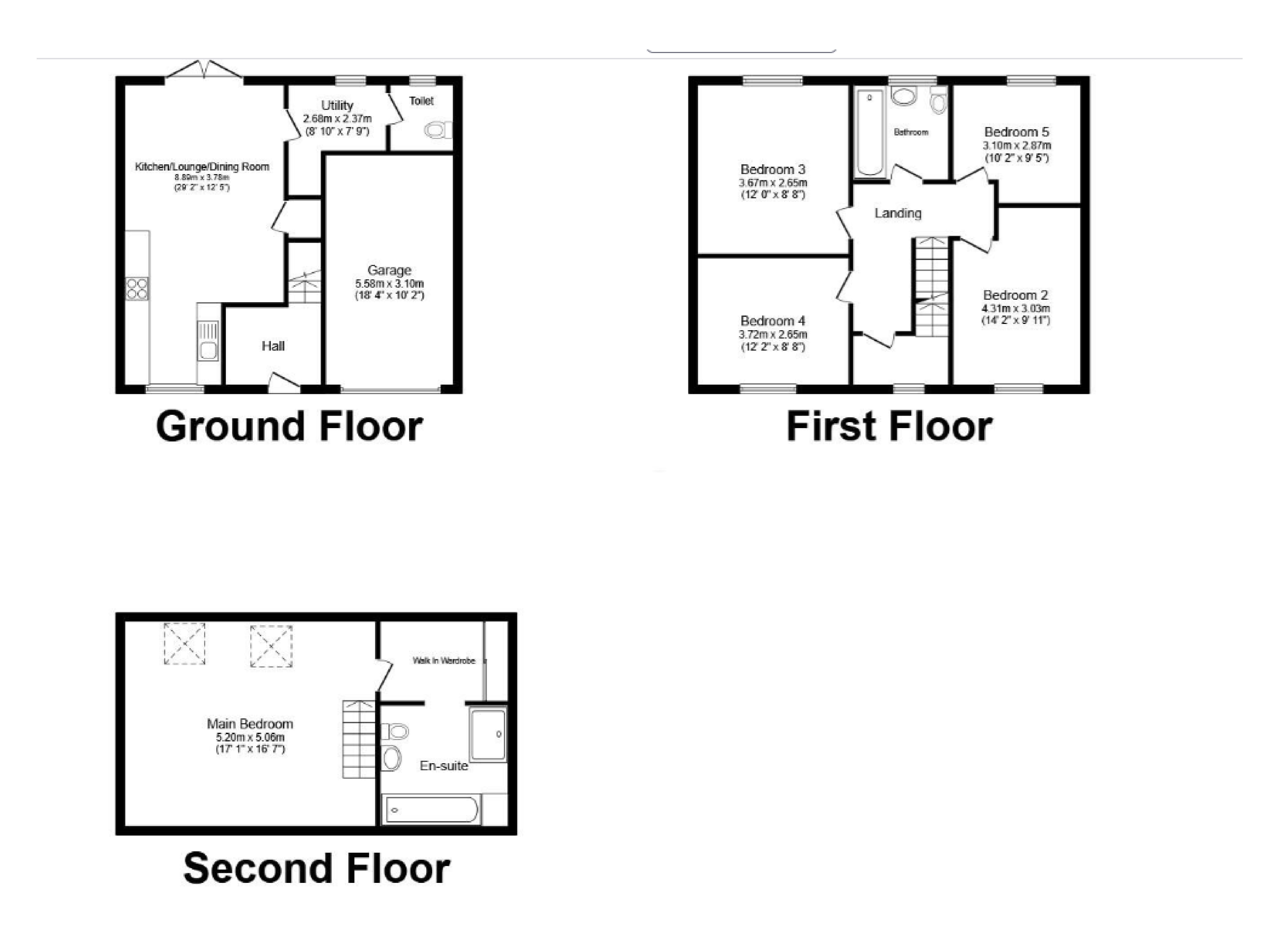 HALLWAY KITCHEN/DINING ROOM/LOUNGE 29' 2" x 12' 2" (8.89m x 3.71m) UTILITY ROOM WC LANDING BEDROOM TWO 14' 2" x 9' 11" (4.32m x 3.02m) BEDROOM THREE 12' x 8' 8" (3.66m x 2.64m) BEDROOM FOUR 12' 2" x 8' 8" (3.71m x 2.64m) BEDROOM FIVE 10' 2" x 9' 5" (3.1m x 2.87m) BATHROOM LANDING BEDROOM ONE 17' 1" x 16' 1" (5.21m x 4.9m) DRESSING ROOM ENSUITE MSEAUREMENTS There is a six inch measurement tolerance or metric equivalent. All measurements are for general guidance purposes only and are approximate. Due to variations and tolerances in metric and imperial measurements, measurements contained in these particulars must not be relied upon for ordering carpet, furniture etc.