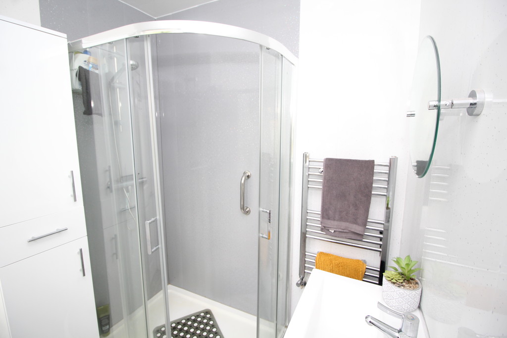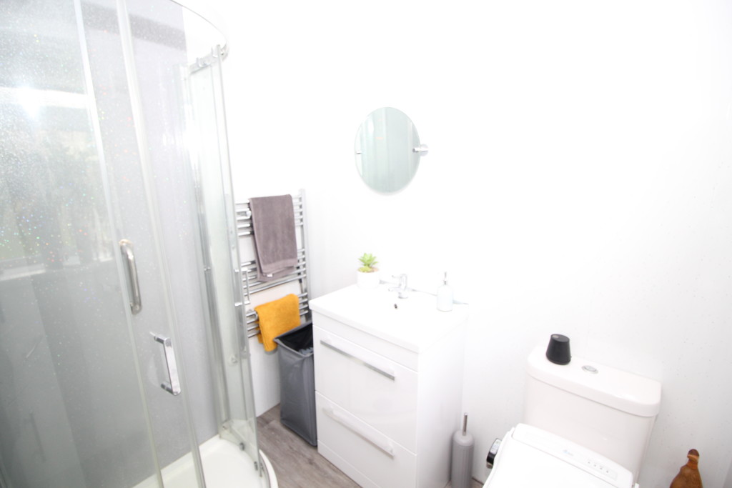 SHOWER ROOM 6' 10" x 5' 10" (2.08m x 1.78m) Having a modern white three-piece suite comprising; low flush WC, hand basin with mixer tap and white storage units beneath, shower cubicle with mains shower, UPVC splash backs, window with obscured glass, chrome towel radiator and extractor fan.