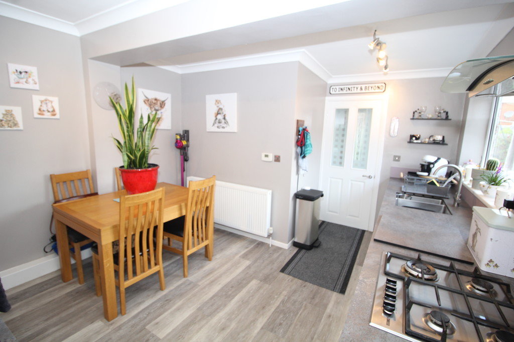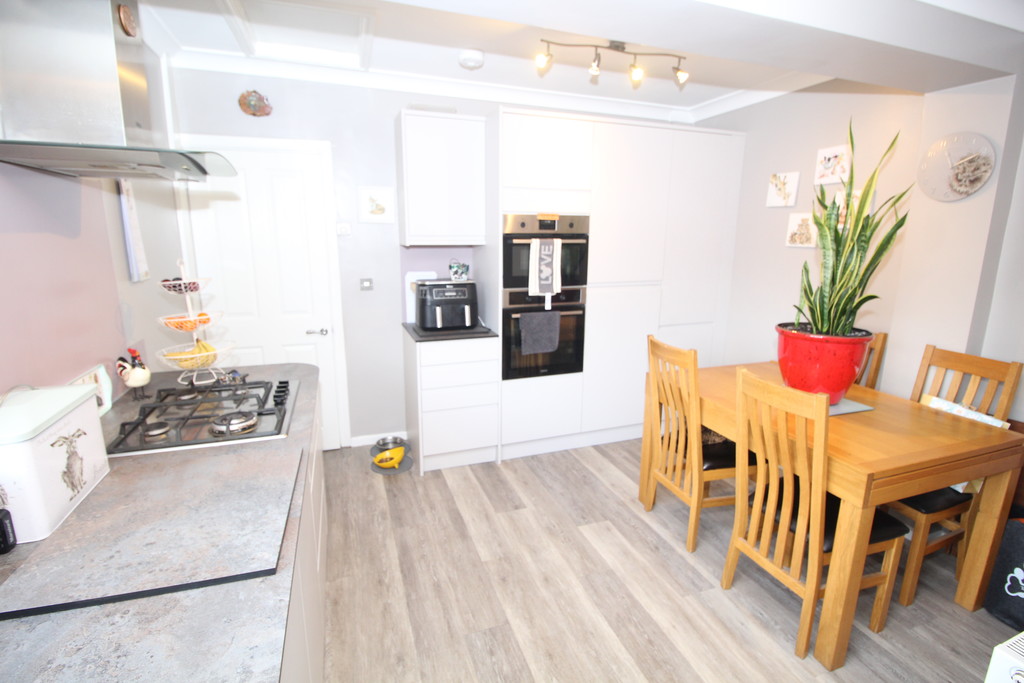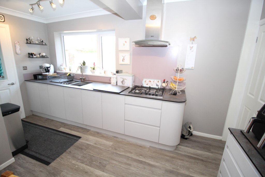 KITCHEN/DINER 14' 4" x 11' 10" (4.37m x 3.61m) Beautifully appointed, having a comprehensive range of grey high-gloss units with soft closing doors and drawers, contrasting slate effect work surface, drainer incorporating one a half bowl sink with mixer tap, built-in electric oven, built-in electric oven/microwave, four ring gas burner with extractor above, integrated automatic washing machine, integrated fridge freezer, ample space for table and chairs, glazed window overlooking rear garden, LVT flooring, access to roof space housing combination condensing boiler.