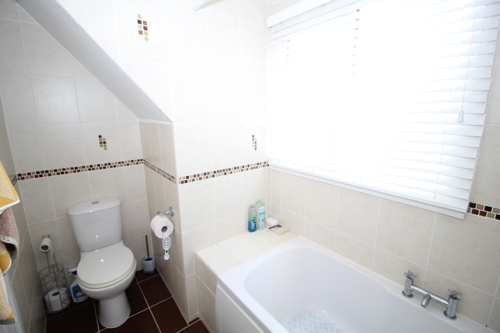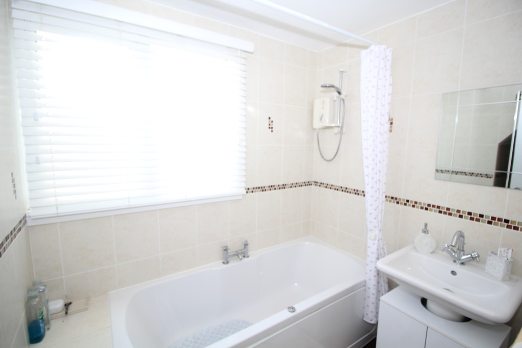 BATHROOM 9' 2" x 5' 5" (2.79m x 1.65m) Being fully tiled with mosaic boarder, having a white three-piece suite comprising; low flush WC, hand basin with mixer tap, panel bath with mixer tap and electric shower over, towel radiator and window with obscure glass.