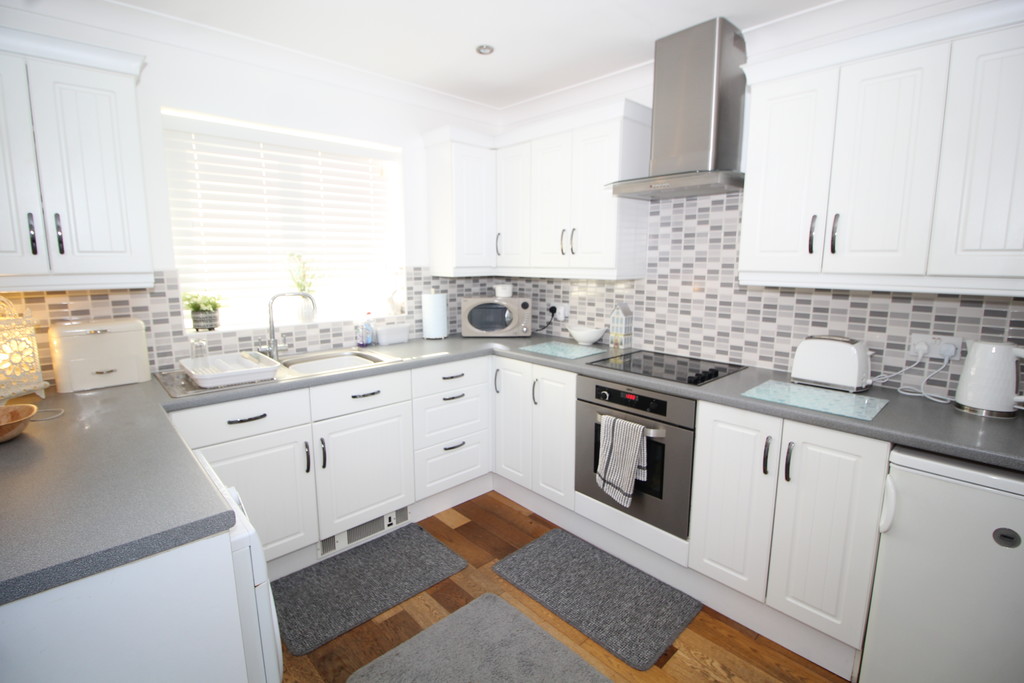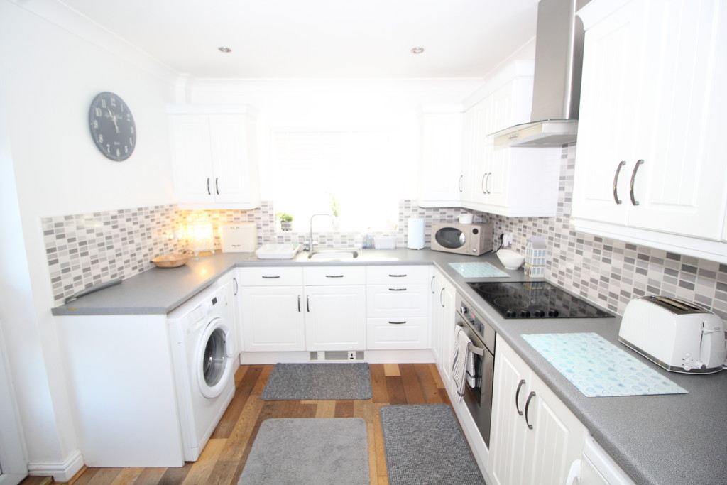 KITCHEN 9' 10" x 8' 10" (3m x 2.69m) Having a comprehensive range of white country style units to high and low-level, with contrasting grey work surface, incorporating sink and drainer with mixer tap, tiled splash backs, built-in electric oven, four ring ceramic hob with extractor above, space and plumbing for automatic washing machine, space for fridge/freezer, solid wood flooring, double glazed window overlooking rear garden, useful store cupboard and side entrance door.