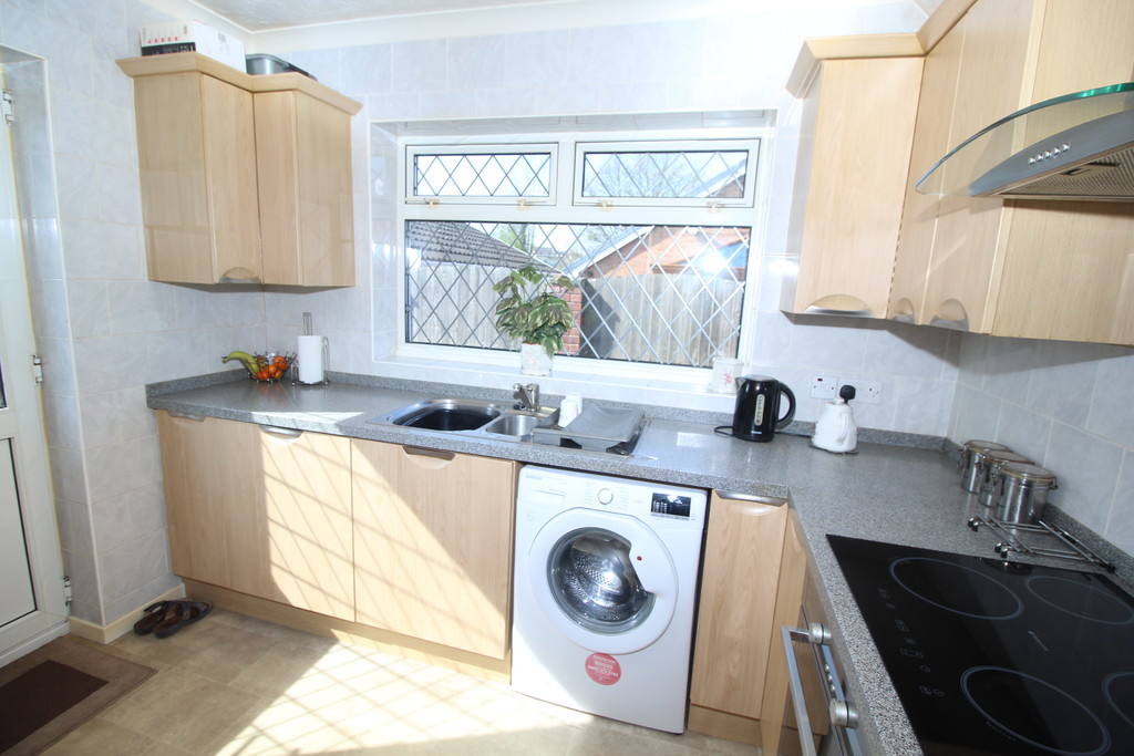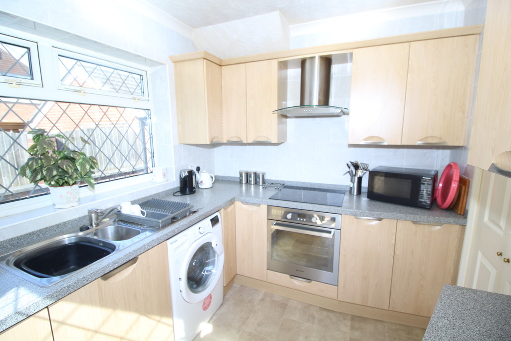 KITCHEN 9' 8" x 7' 5" (2.95m x 2.26m) Being fully tiled and having a range of modern light ash affect wall and base units with contrasting work surface, incorporating one a half bowl sink and drainer with mixer tap, built-in electric oven, four ring ceramic hob with extractor above, integrated fridge freezer, space and plumbing for automatic washing machine, double glazed window and rear access door.