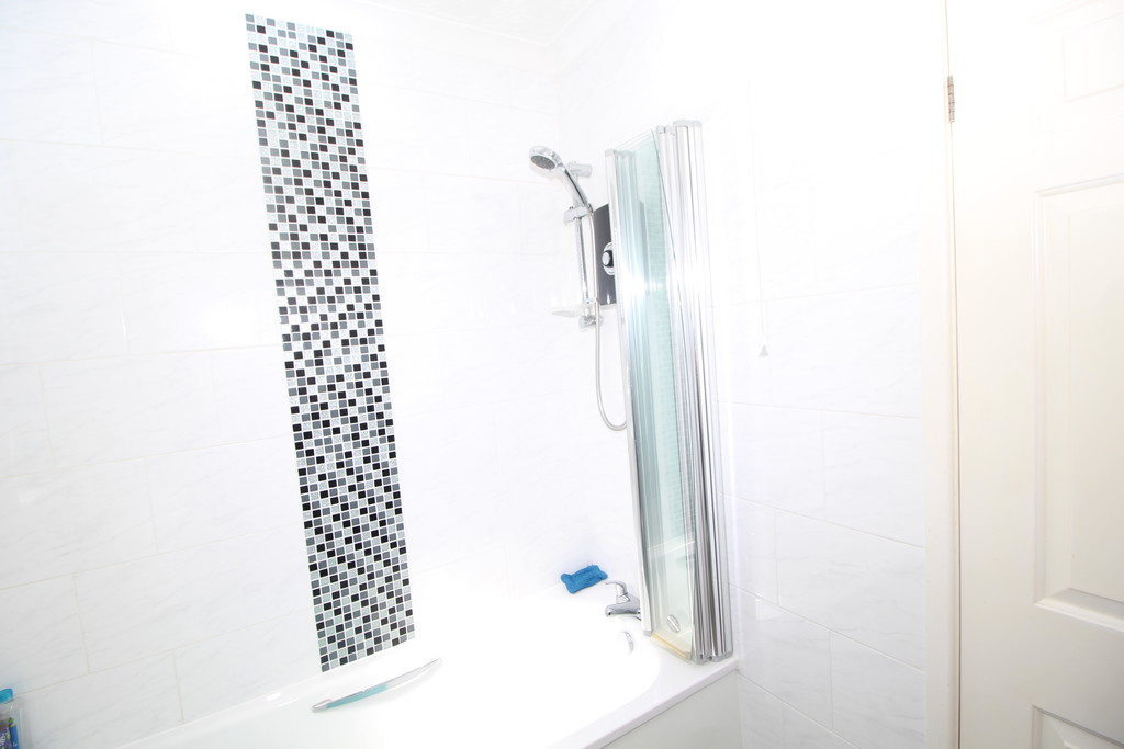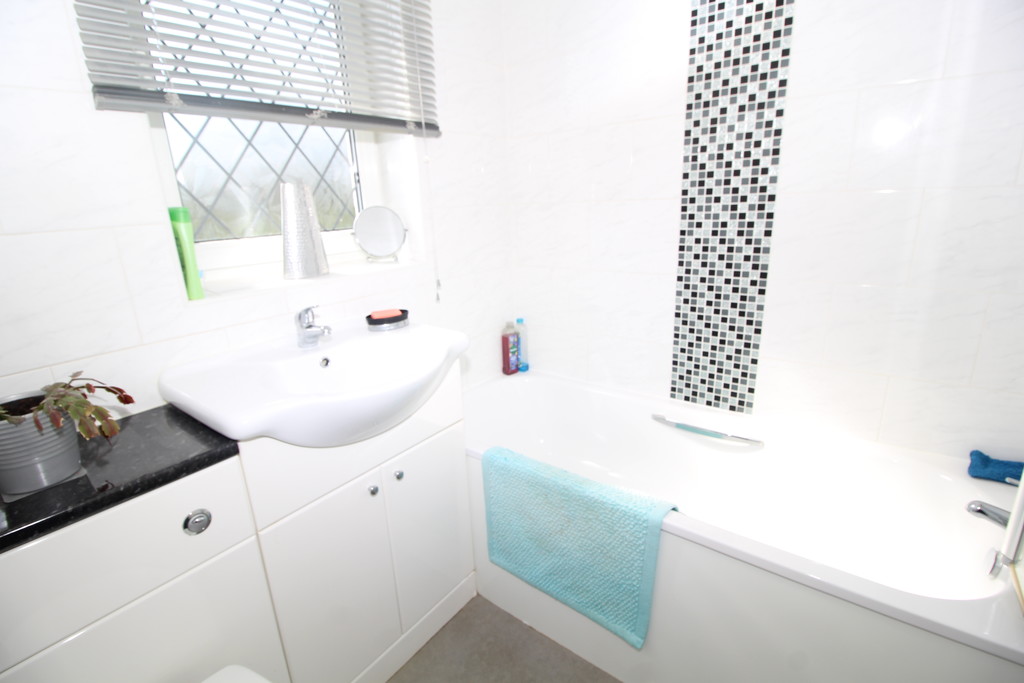 BATHROOM 6' 7" x 5' 5" (2.01m x 1.65m) Being fully tiled with mosaic inlay and having a modern white three-piece suite comprising: low flush WC with concealed cistern, hand basin with storage beneath and mixer tap, panel bath with mixer tap, electric shower over, chrome towel radiator and a window with obscured glass.