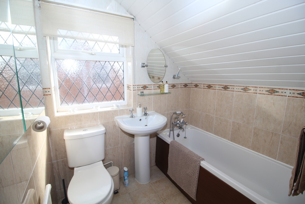 BATHROOM 8' 5" x 6' 7" (2.57m x 2.01m) Being fully tiled and having a white three-piece suite comprising: low flush WC, pedestal hand basin with mixer tap, panel bath with mixer tap and shower attachment, tiled floor, window with obscured glass, central heating radiator and airing cupboard housing hot water cylinder.