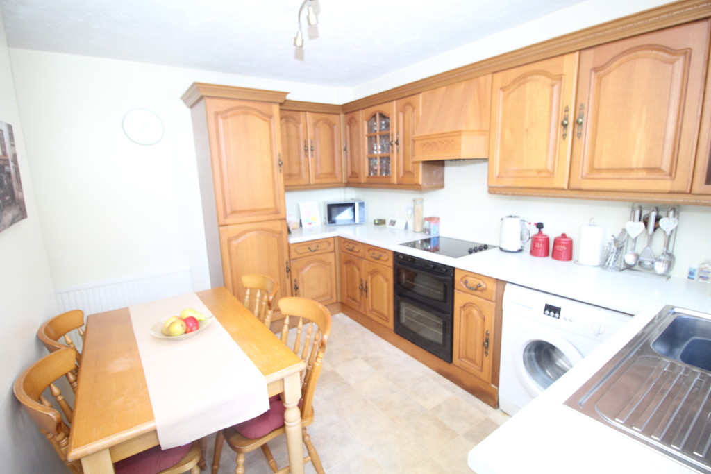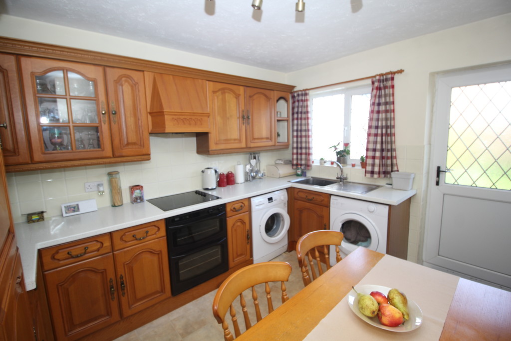 KITCHEN 12' 10" x 9' 0" (3.91m x 2.74m) Having a comprehensive range of solid wood fronted units to high and low-level with contrasting work surface, incorporating sink and drainer with mixer tap tiled splash backs, built-in electric double oven, four ring ceramic hob with extractor above, integrated fridge/freezer, space and plumbing for automatic washing machine and tumble dryer, space for table and chairs, double glazed window overlooking rear garden, central heating radiator and rear access door.