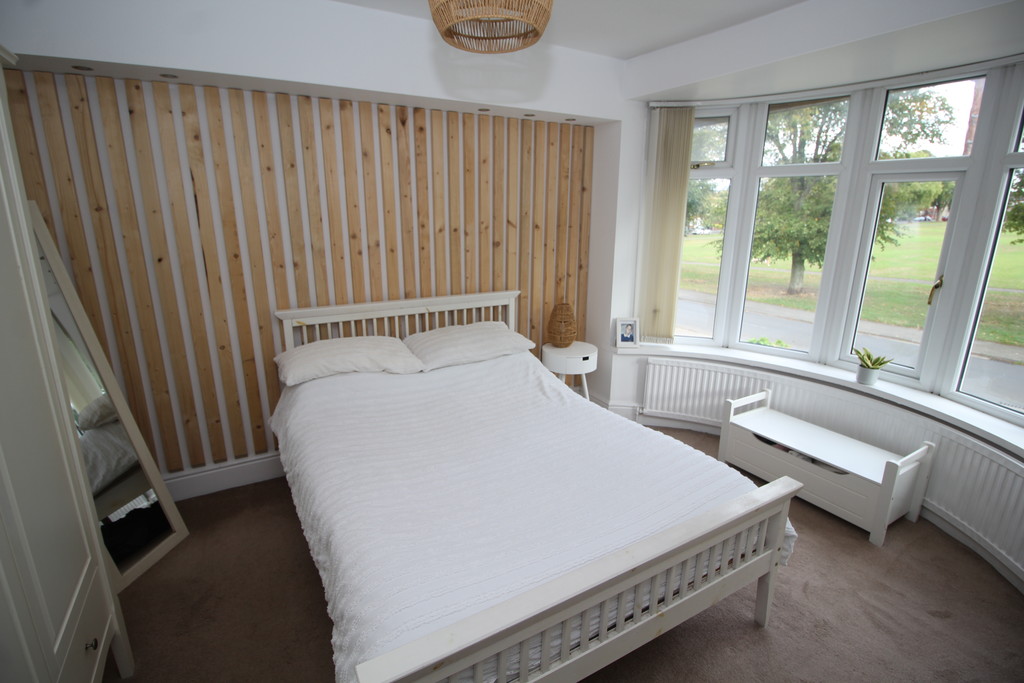 BEDROOM ONE 10' 10" x 10' 10" (3.3m x 3.3m) Having double glazed bay window overlooking Haw Hill parking and letting in plenty of natural light, curved central heating radiator and feature wall backdrop.