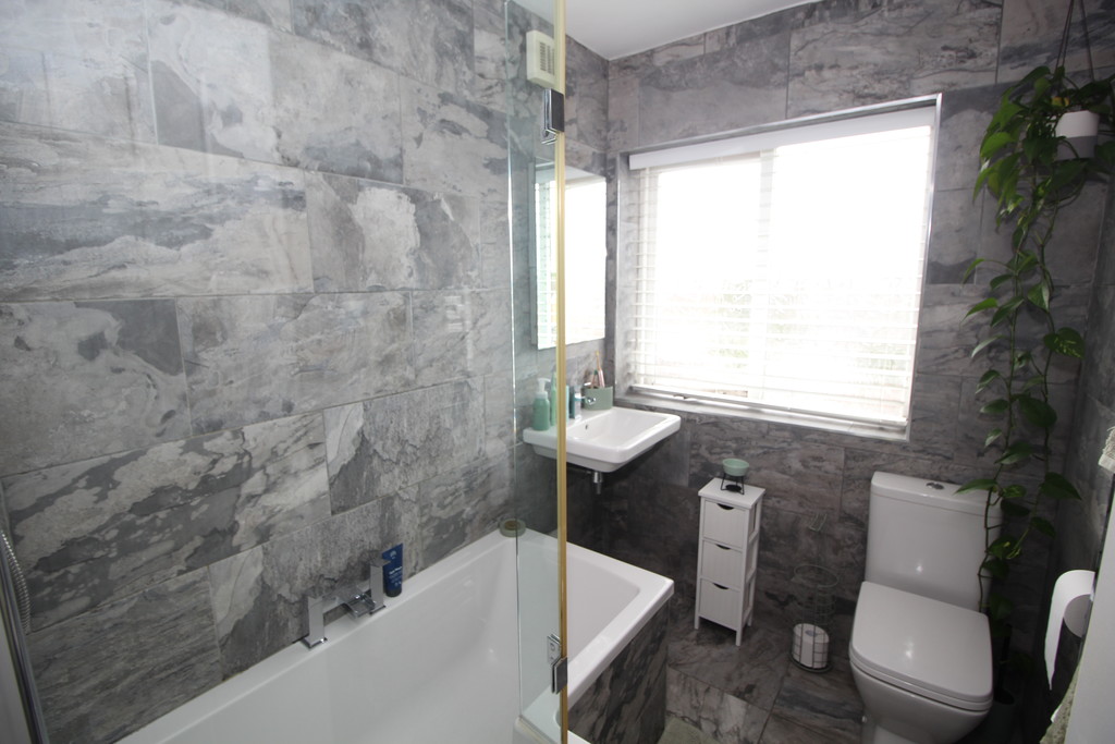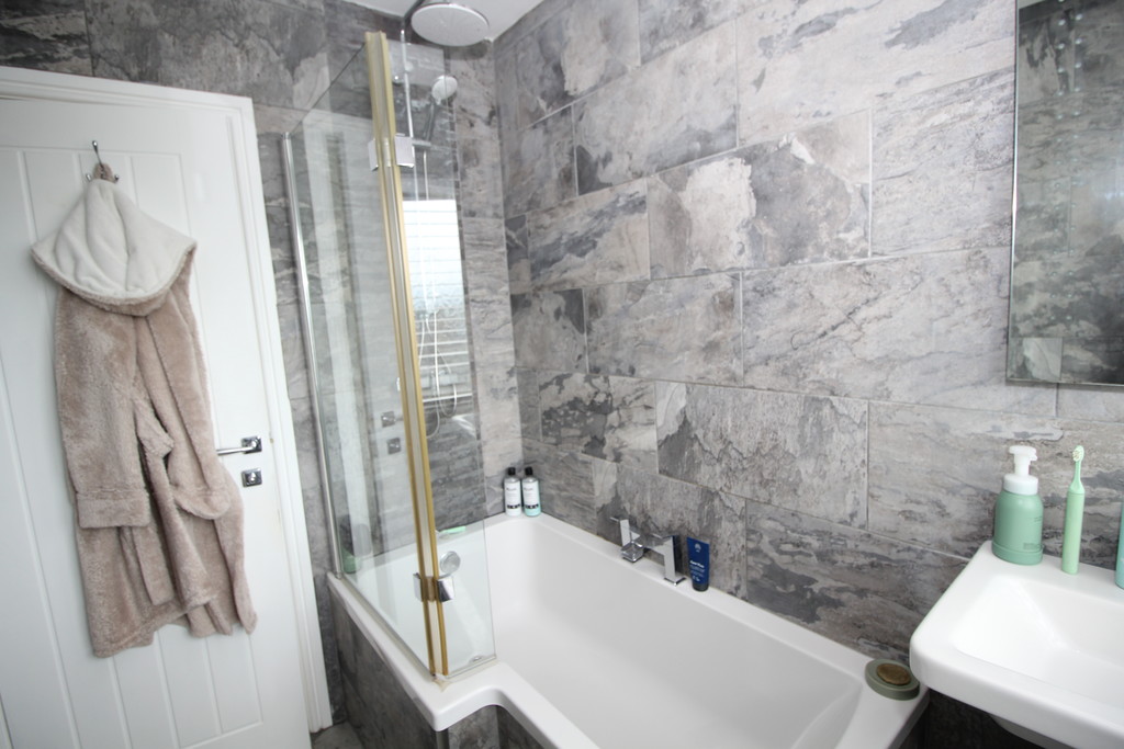 BATHROOM 7' 3" x 5' 5" (2.21m x 1.65m) Fully tiled with brick set ceramic tiling and chrome edging, having a modern white contemporary three-piece suite comprising; low flush WC, pedestal hand basin with waterfall mixer tap, panel bath with waterfall mixer tap, drench and riser shower with glass shower screen, tiled floor and chrome towel radiator.