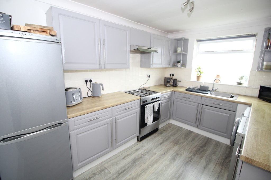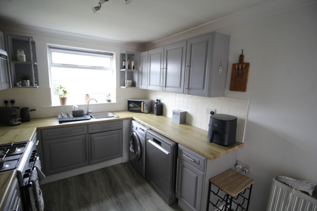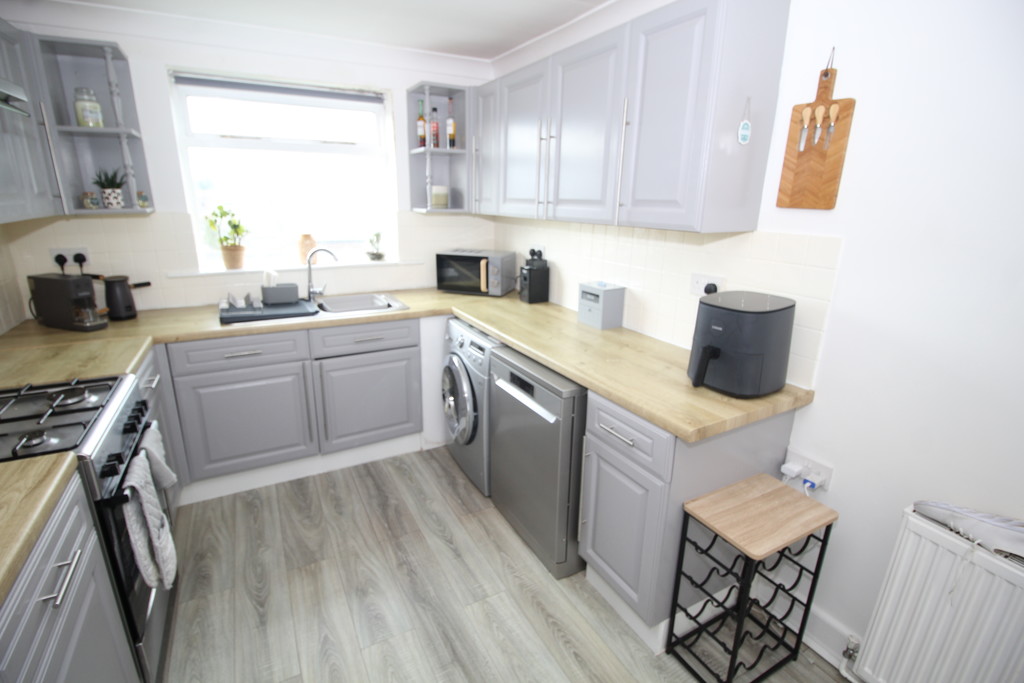 KITCHEN 11' 10" x 8' 8" (3.61m x 2.64m) Having a range of painted Grey units with Rod handles, contrasting work surface with sink and drainer, tiled splash backs, space and gas point for cooker with extractor above, space and plumbing for automatic washing machine and dishwasher, space for fridge/freezer, laminate wood flooring, double glazed window with pleasant aspect overlooking rear garden, built-in store cupboard housing combination condensing boiler and useful under stairs store cupboard.