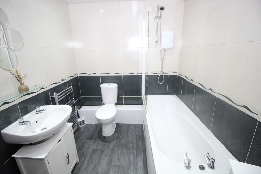 BATHROOM 7' 2" x 6' 5" (2.18m x 1.96m) Being fully tiled and having a white three-piece suite comprising: low flush WC, pedestal hand basin, panel bath with electric shower over, chrome towel radiator and extractor.