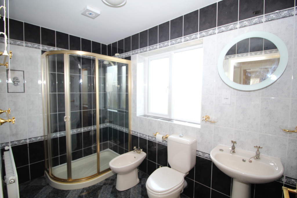 SHOWER ROOM 9' 8" x 5' 6" (2.95m x 1.68m) Being fully tiled and having a 4 piece suite comprising; low flush WC, pedestal hand basin, bidet, shower cubicle with electric shower, window with obscured and glass tiled floor.