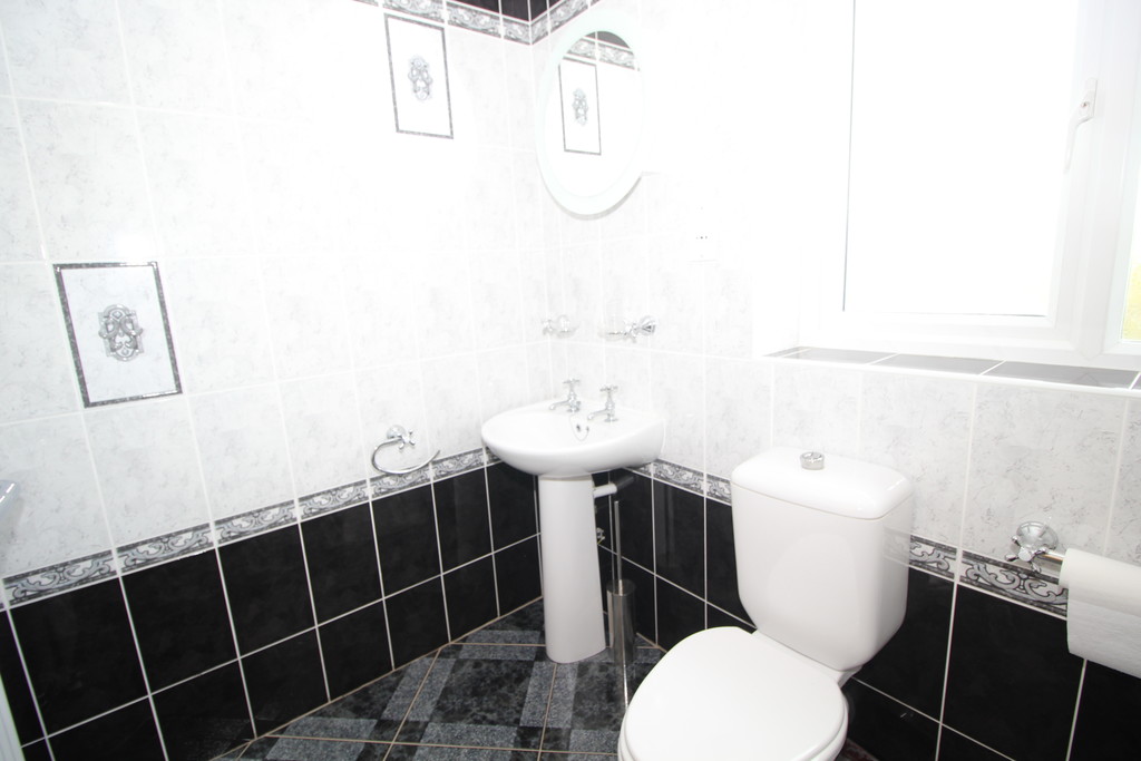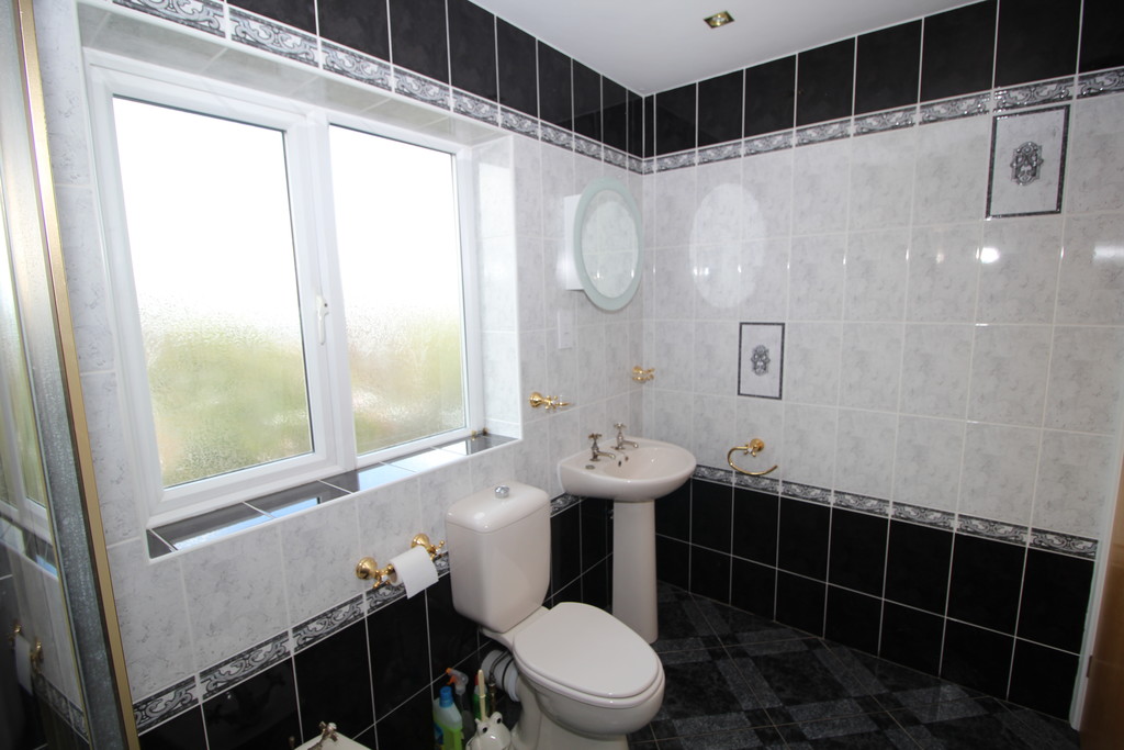 BATHROOM 7' 11" x 5' 0" (2.41m x 1.52m) Being fully tiled with ceramic tiling and having three-piece suite comprising; low flush WC, pedestal hand basin, panel bath with mains shower over and concertina shower screen, extractor fan, tiled floor and window with obscured glass.