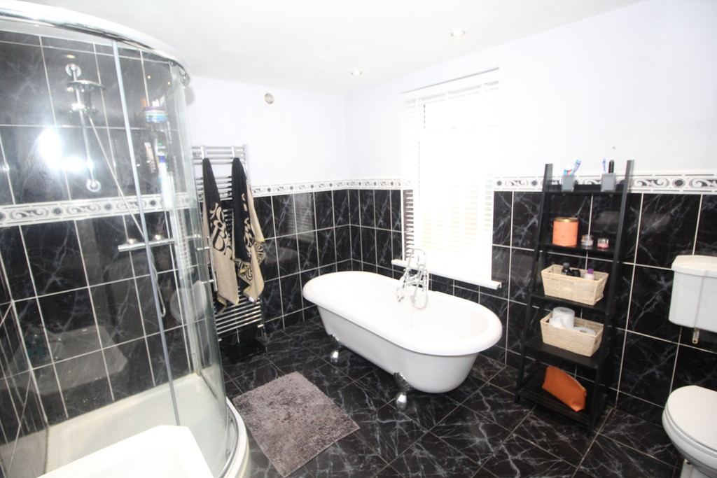 BATHROOM 10' 10" x 9' 2" (3.3m x 2.79m) Beautifully appointed and predominately tiled, having white 4 piece suite comprising: low flush WC, hand basin, shower cubicle with mains shower, roll-top bath with chrome feet, mixer tap, telephone style shower attachment, chrome towel radiator, window with obscured glass, central heating radiator, tiled floor and extractor fan.