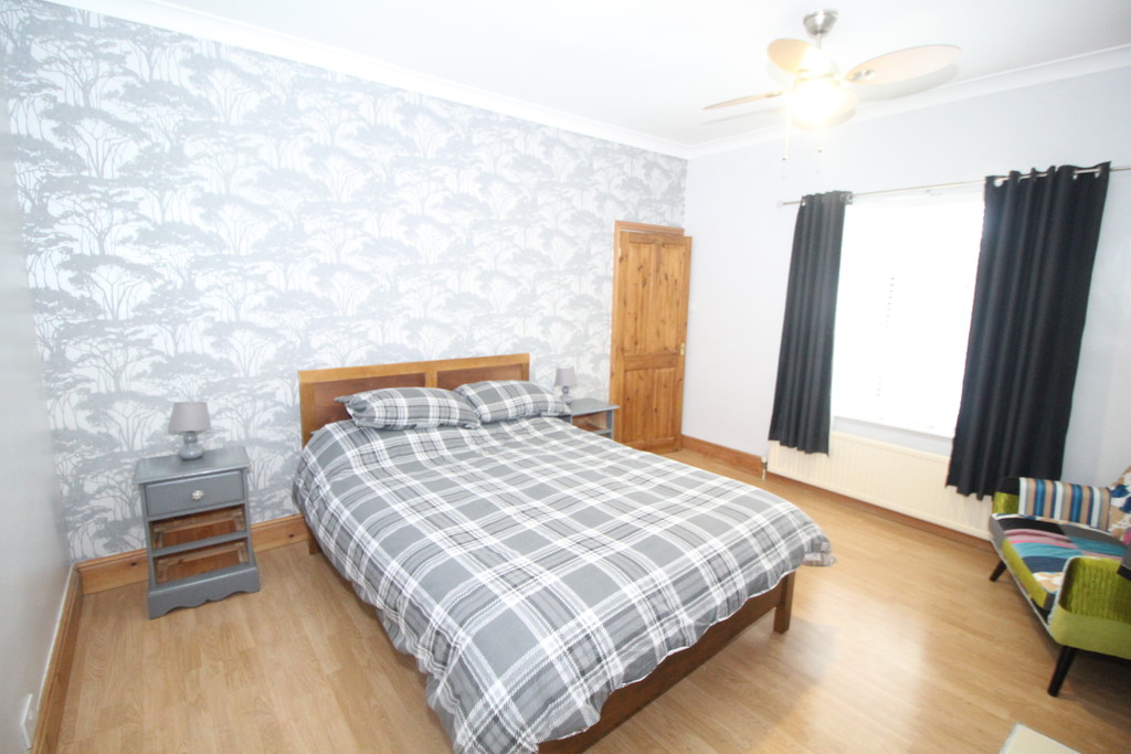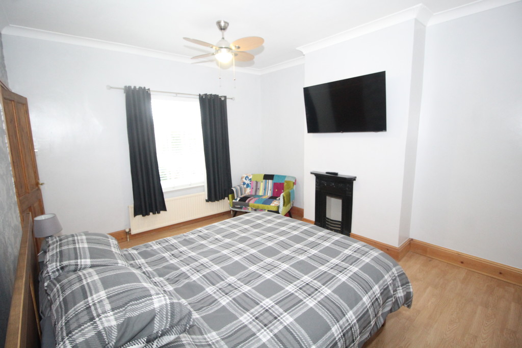 BEDROOM ONE 14' 1" x 12' 3" (4.29m x 3.73m) Having decorative open grey cast-iron fire with tiled hearth, laminate wood flooring, feature papered wall, central heating radiator and double glazed window over looking rear garden.