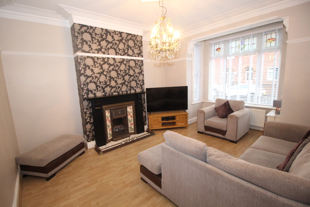 LOUNGE 15' 7" x 13' 8" (4.75m x 4.17m) A good size room, having cast-iron gas fire with tiled inlay, black surround and tiled hearth on a feature papered wall backdrop, double glazed bay window letting in plenty of natural light, central heating radiator, laminate wood flooring, TV point, telephone point, cornice to ceiling and picture rail.