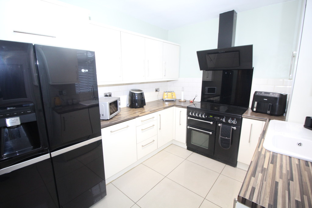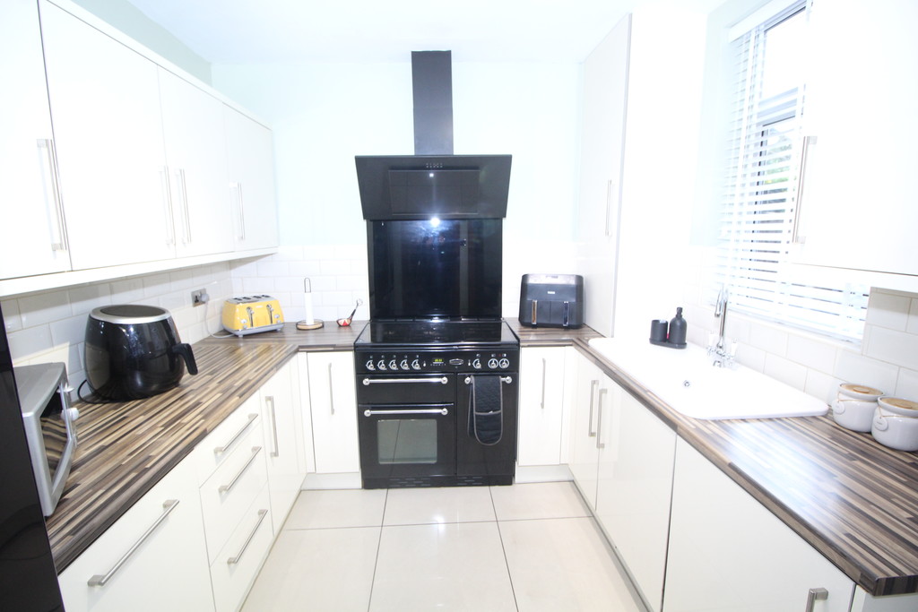 KITCHEN 10' 10" x 9' 2" (3.3m x 2.79m) Beautifully appointed and having a range of modern cream high-gloss units to high and low-level with rod handles, contrasting block wood effect work surface incorporating, ceramic sink and drainer with mixer tap, brick set tiled splash backs, space and gas point for a range cooker, glass splash back, contemporary extractor fan, space for American fridge/freezer, integrated washing machine and dish washer, tiled floor, double glazed window and side access door.