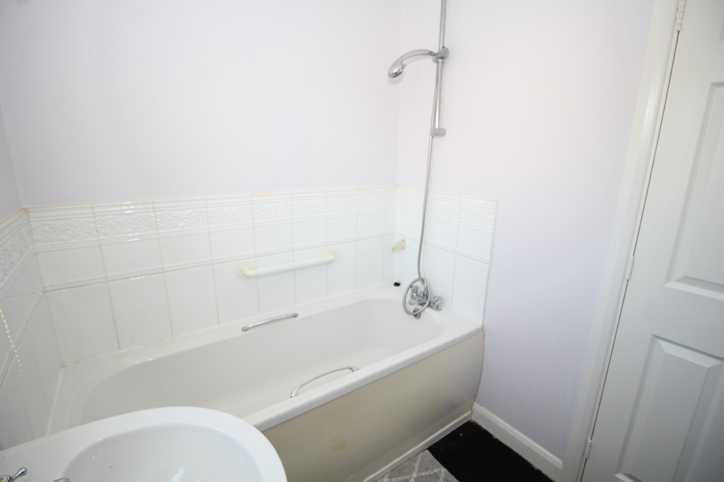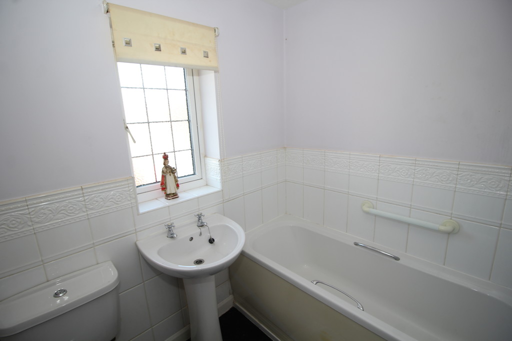 BATHROOM 6' 6" x 5' 6" (1.98m x 1.68m) Having a white three-piece suite comprising; low flush WC, pedestal hand basin, panel bath with shower attachment, ceramic tiling, central heating radiator, extractor fan and window with obscured glass.