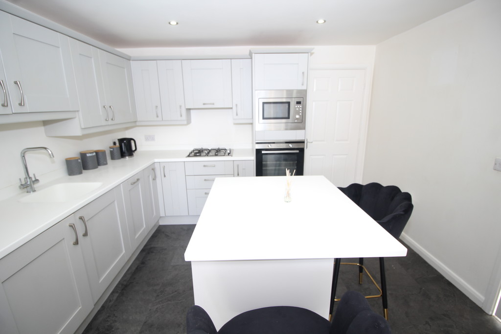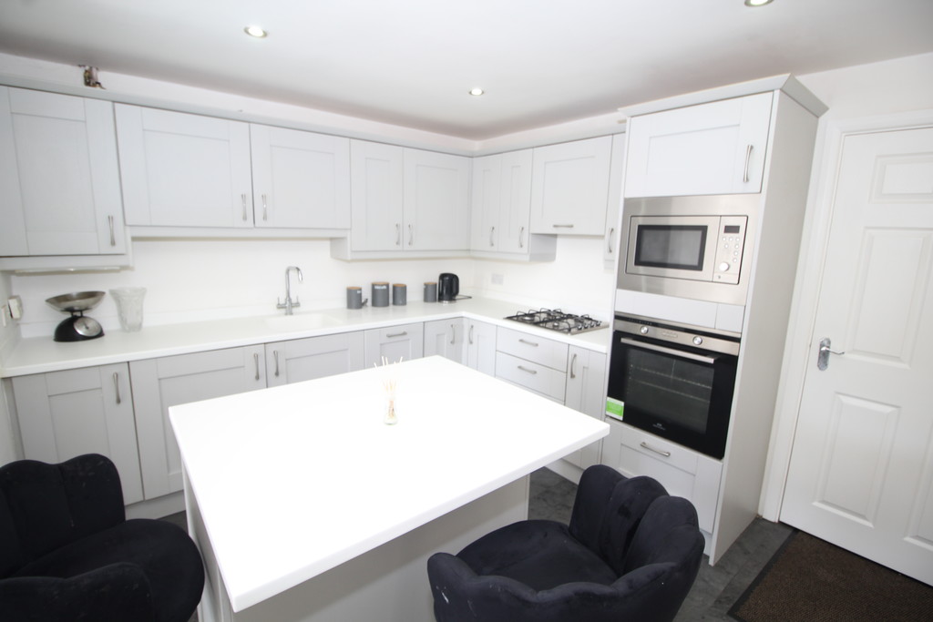 KITCHEN 11' 5" x 9' 10" (3.48m x 3m) Having a comprehensive range of modern Shaker style grey units, with contrasting work surface incorporating sink with mixer tap, splash backs, built-in electric oven, built-in microwave, four ring gas burner, extractor above, center island breakfast bar, integrated slimline dishwasher, integrated washing machine and arch to to: