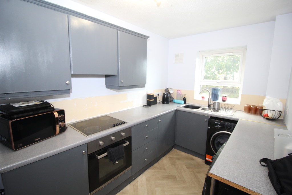 KITCHEN 12' 7" x 7' 0" (3.84m x 2.13m) Having a range of wall and base units with work surface, incorporating sink and drainer with mixer tap and tiled splash backs, breakfast bar, built-in electric oven, four ring electric hob with extractor above, space and plumbing for automatic washing machine, space fridge/freezer and double glazed window overlooking communal gardens.