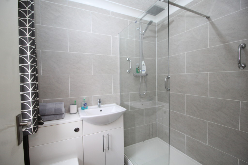 SHOWER ROOM 6' 6" x 5' 2" (1.98m x 1.57m) Beautifully appointed and fully tiled with ceramic brick set tiling, having a modern white three-piece suite comprising; low flush WC with concealed cistern, hand basin with mono block mixer tap and storage beneath, double shower cubicle with drench and riser, central heating radiator, double glazed window, extractor and laminate wood flooring.
