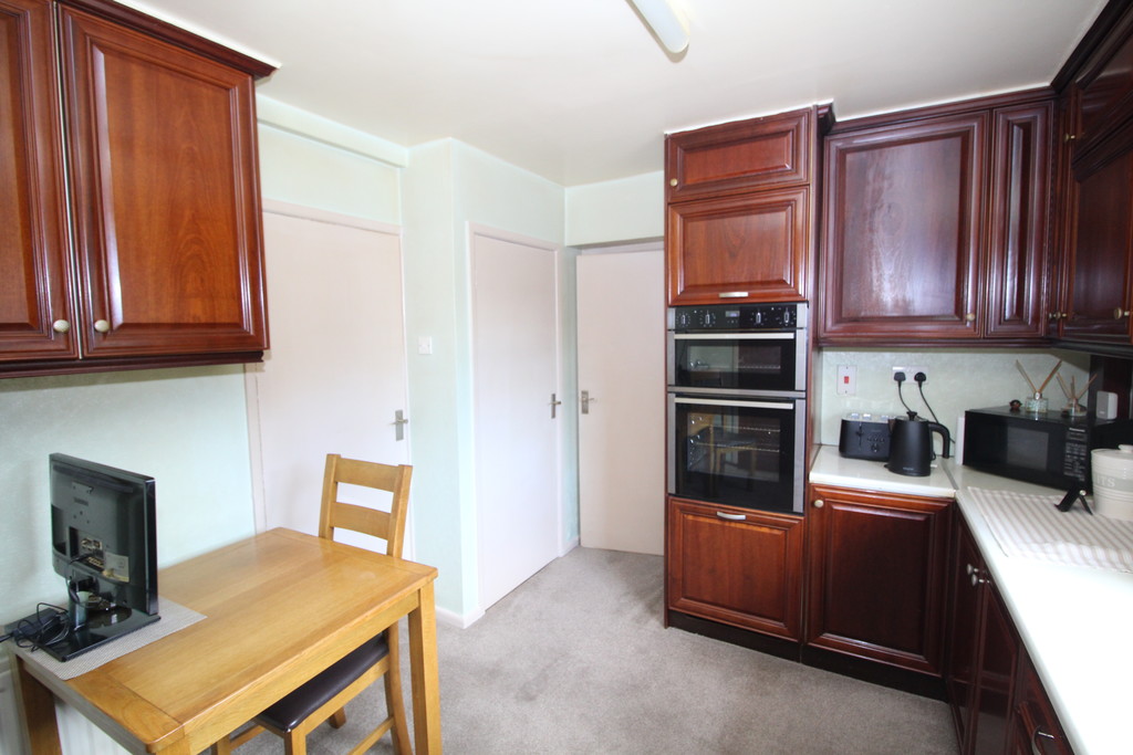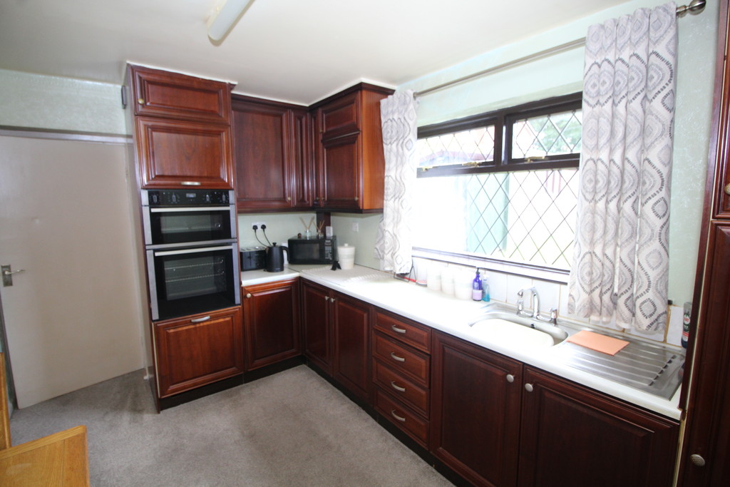 DINING KITCHEN 12' 2" x 9' 8" (3.71m x 2.95m) A good size room having a comprehensive range of mahogany units to high and low-level with contrasting work surface, incorporating sink and drainer with mixer tap, tiled splash backs, built-in electric double oven, four ring ceramic hob with extractor above, central heating radiator, under stairs store cupboard and double glazed window with pleasant aspect over looking rear garden.