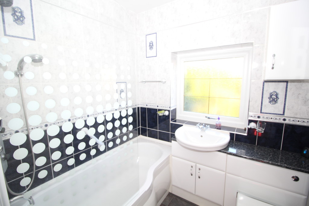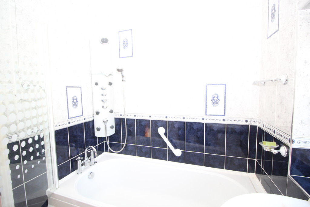BATHROOM 6' 7" x 5' 9" (2.01m x 1.75m) Being fully tiled with ceramic tiling with border, having a white three-piece suite comprising: low flush WC with cistern, inset hand basin with mixer tap and storage beneath, shower bath, shower unit with body jets and glass screen, window with obscured glass, chrome towel radiator and an extractor.