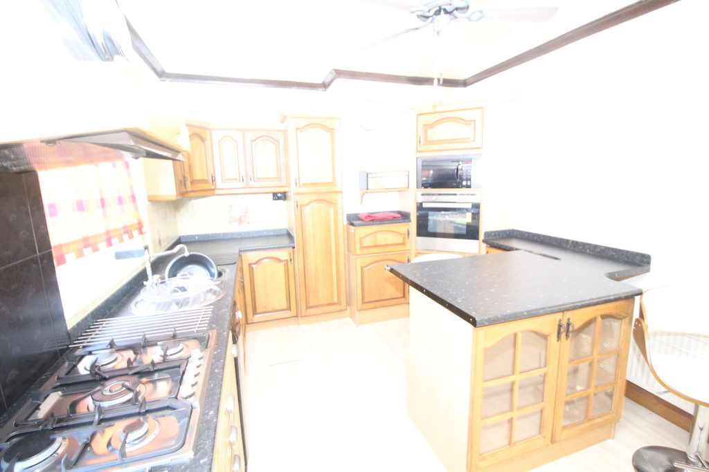 DINING KITCHEN 17' 5" x 10' 2" (5.31m x 3.1m) Having a comprehensive range of oak units to high and low-level with contrasting work surface, incorporating sink and drainer with mixer tap, tiled splash backs, built-in electric double oven, built-in microwave, five ring gas burner with extractor canopy above, space and plumbing for washing machine, peninsular breakfast bar, two double glazed windows over looking rear garden, tiled floor, space for fridge/freezer, central heating radiator, rear access door and store cupboard housing central heating boiler.