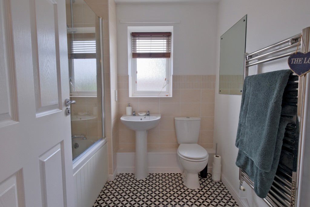BATHROOM 7' 0" x 6' 9" (2.13m x 2.06m) Having a modern white three-piece suite comprising: low flush WC, pedestal hand basin, panel bath with mixer tap and shower attachment, glass shower screen, central heating radiator, extractor fan and a window with obscured glass.
