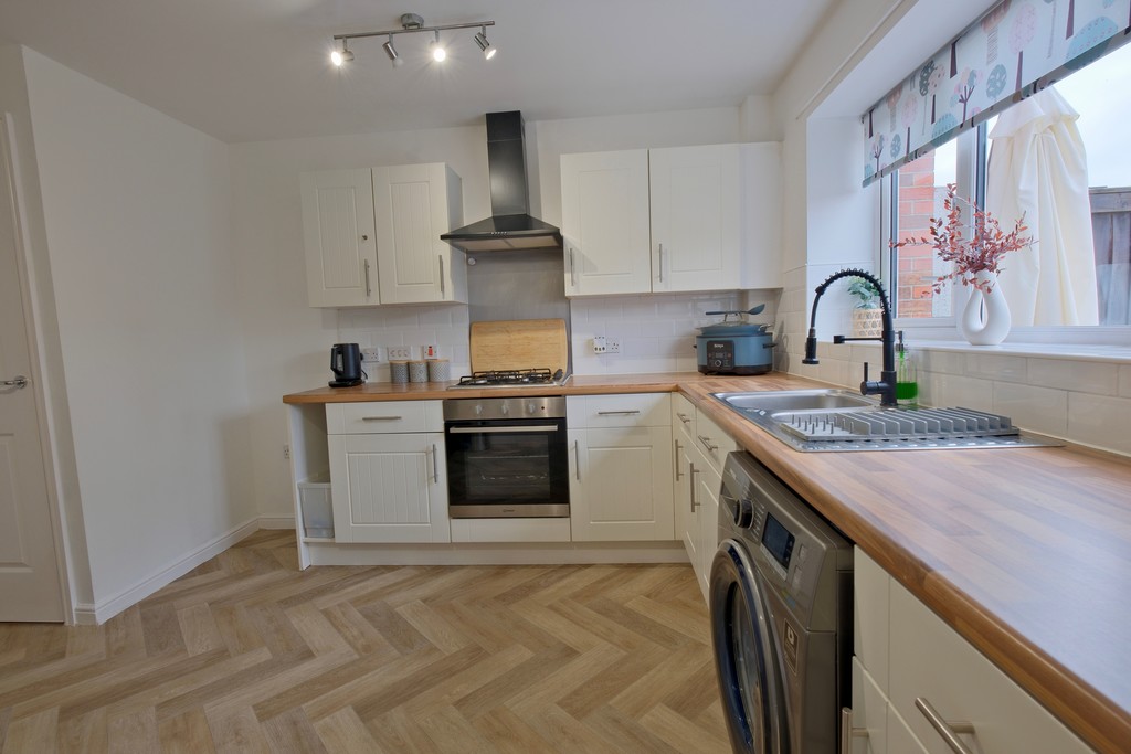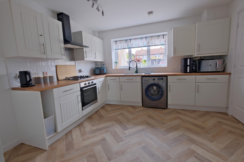 DINING KITCHEN 13' 6" x 11' 0" (4.11m x 3.35m) Having a comprehensive range of modern country style units with steel handles, contrasting block would effect work surface, incorporating one a half bowl sink and drainer with mixer tap, brick set tiled splash backs, built-in electric oven, four ring gas hob, stainless steel splash back, extractor canopy, space for fridge/freezer, space and plumbing for automatic washing machine, ample space for table and chairs, double glazed window overlooking rear garden and a store cupboard.