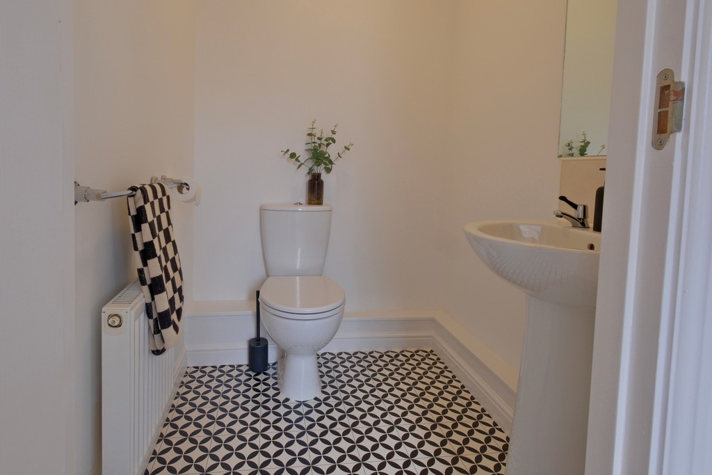 CLOAKROOM/WC Having two-piece suite comprising; low flush WC, pedestal hand basin with tiled splash backs, central heating radiator and extractor.