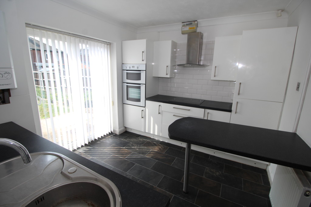 KITCHEN 9' 3" x 10' 8" (2.82m x 3.25m) Having a comprehensive range of white high-gloss units to high and low-level with steel handles, contrasting work surface, sink and drainer with mixer tap, peninsular breakfast bar, built-in double over, ceramic hob with extractor above, brick set tiled splash backs, combination condensing boiler and patio doors to rear garden.