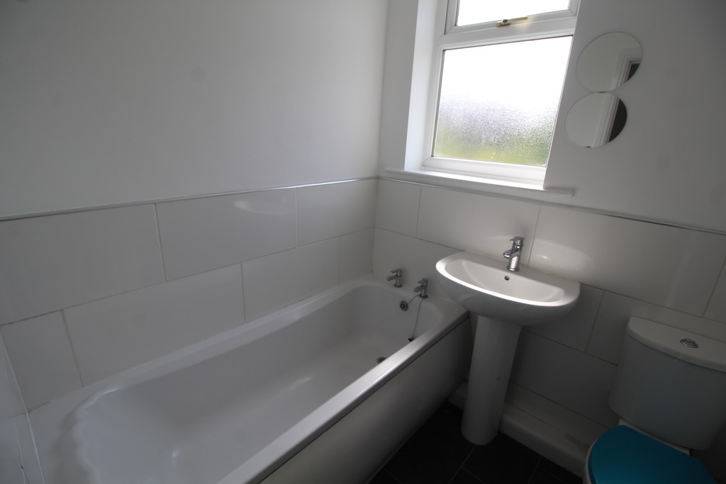 BATHROOM 5' 6" x 5' 11" (1.68m x 1.8m) Having white three-piece suite comprising; low flush W.C, pedestal hand basin with mixer tap, panel bath with tiled splash backs, window with obscured glass and central heating radiator.