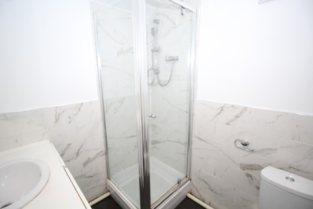 EN-SUITE SHOWER ROOM 6' 0" x 6' 7" (1.83m x 2.01m) Having a white three-piece suite comprising; low flush W.C, sink unit with storage beneath, tiled shower cubicle with mains shower and an extractor fan.
